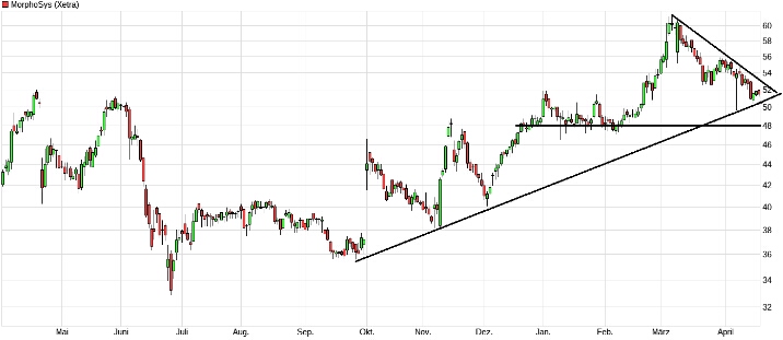 Bei Morphosys geht es gemächlicher zu aber laut Charttechnik spitzt sich das Dreieck immer mehr zu. Hier sollte es in den nächsten 2 Wochen einen Ausbruch daraus geben und meiner Meinung nach nach oben.....Charttechnisch folgt.....