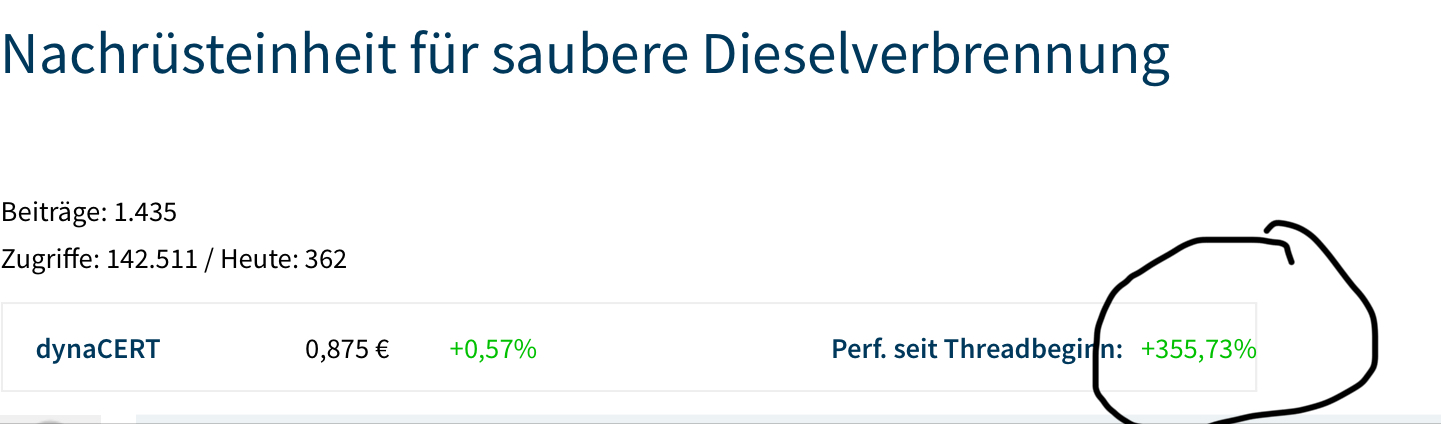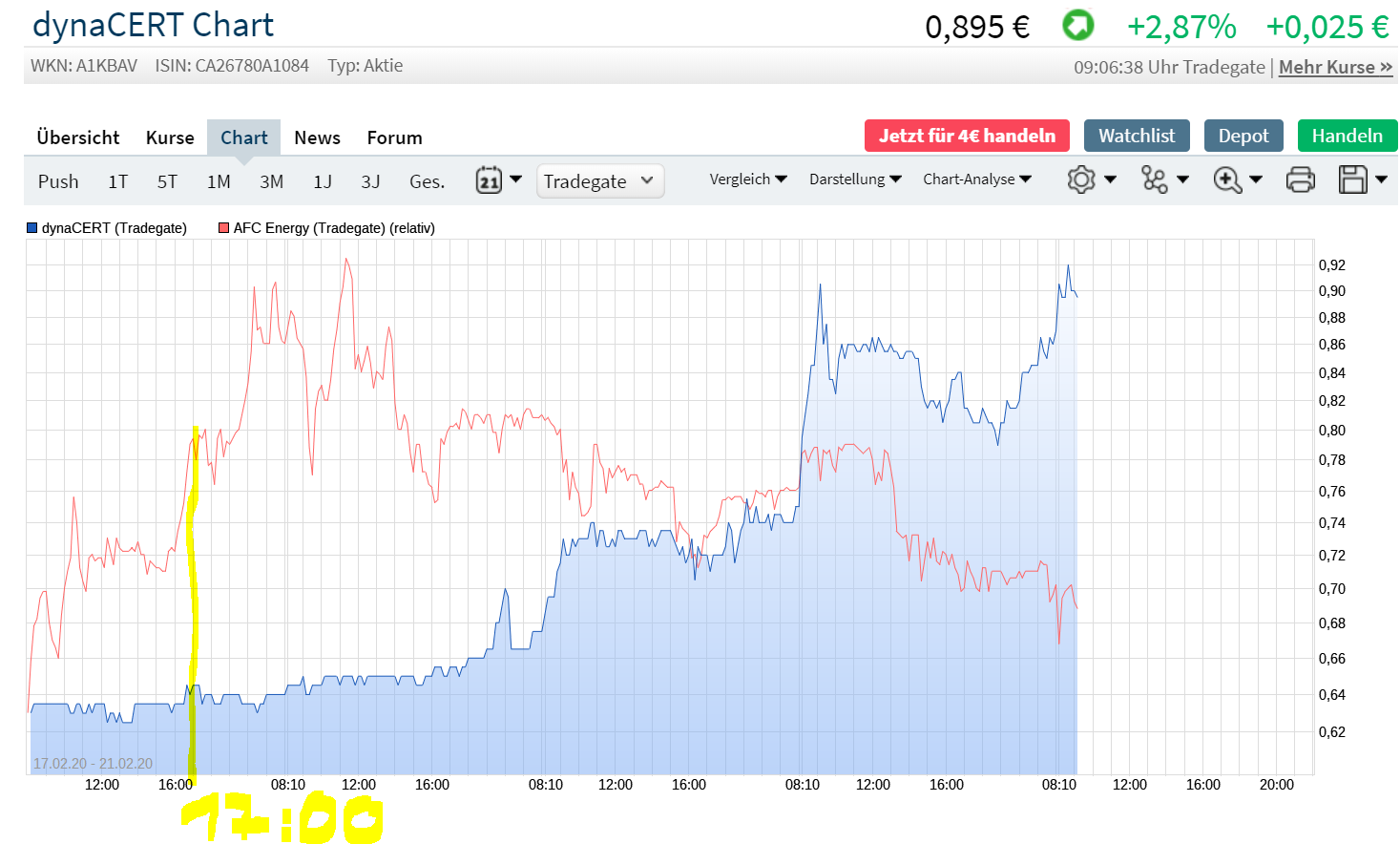 Viel mehr aufgeregt hat mich, dass der Vergleich einer AFC Energie (die ich als durchaus vielversprechende Aktie halte) gebracht hat, weil diese halt gerade gestiegen ist. Die beiden Aktien haben zwar eine gewisse Abhängigkeit (zukünftig wird der Anteil der H2 angetriebenen Fahrzeuge die Diesel ablösen) aber trotzdem einen ganz anderen Fokus. Fairer würde ich da schon sehen, wenn jemand Baumot ins Gespräch bring und diese langfristig vergleicht und nicht weil gerade ein Kurssprung stattgefunden hat. Wollte man damit AFC "gut-" oder Dynacert "schlechtreden"?
