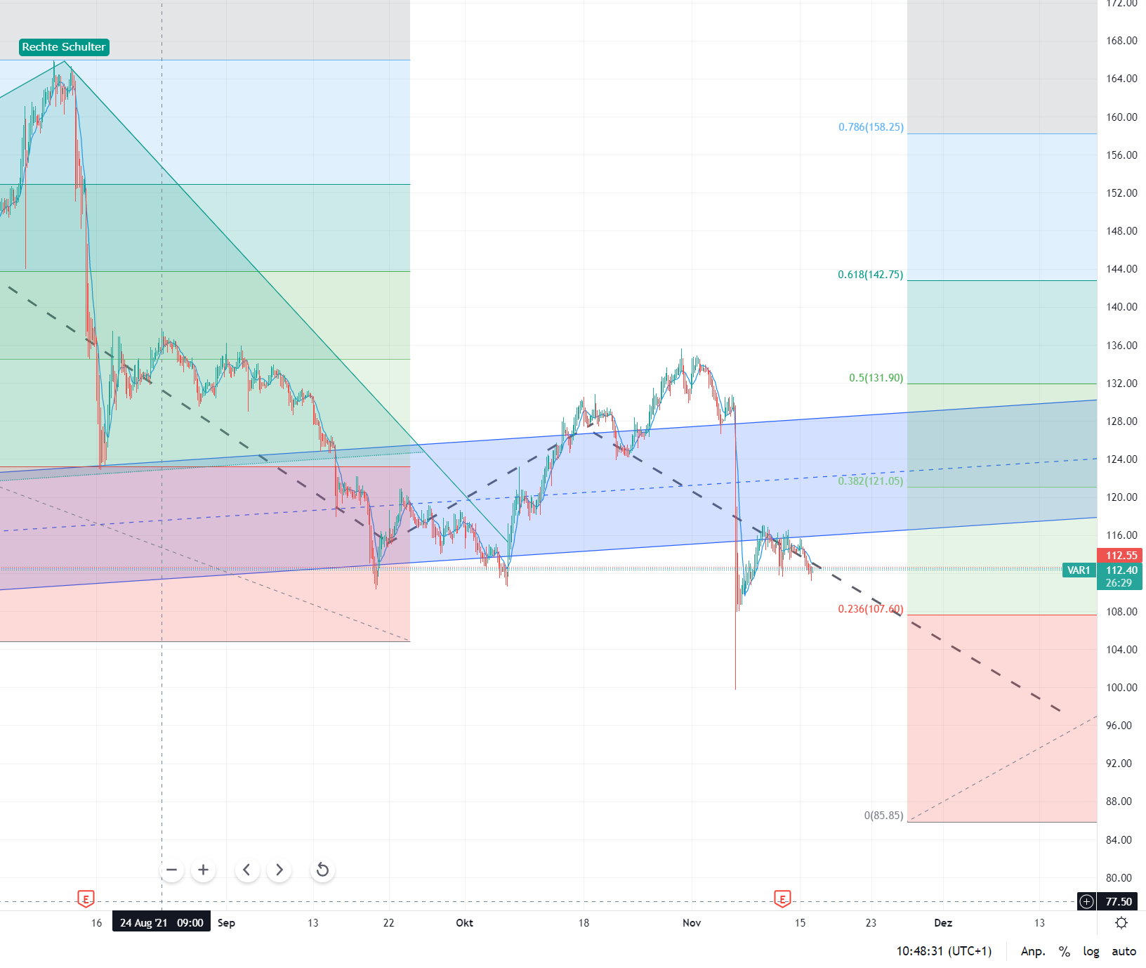 Das es einbrechen muss stand schon länger im Raum. Bisher sieht der Korrektur nach “normalen” Korrekturwelle von Coronatief bis ATH. (Ganz nebenbei: der Coronatief (52 EUR) war 61,8er Retracement von Börsenwiedereinführung bis ATH Dez. 2019).