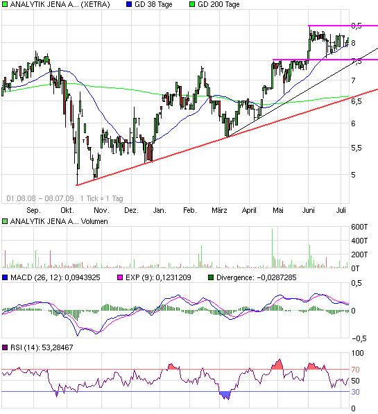 Ich denke das die Unterstützung bei 7,50 Euro, weil recht massiv, hält. Sprünge nach oben erwarte ich für die nächsten 2 Monate nicht, weil wahrscheinlich keine fundamentalen News kommen. Somit bin ich für die nächsten Wochen mit ner seitwärtsbewegung vollstens zufrieden. Die Outperformance zum Gesamtmarkt wird schon noch kommen, ich denke gegen Jahresende bzw. Richtung Q1-Zahlen fürs nächste Geschäftsjahr.