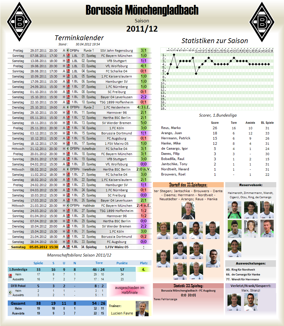 Dickes Minus und Favre will nicht vorzeitig verlängernDer fünfmalige deutsche Meister Borussia Mönchengladbach hat im Geschäftsjahr 2011 ein Minus von 3,5 Millionen Euro gemacht und damit erstmals seit zehn Jahren rote Zahlen geschrieben. Erfolgstrainer Lucien Favre soll den Verein, der zurzeit 52 500 Mitglieder hat, langfristig betreuen, will derzeit seinen Vertrag aber nicht vorzeitig verlängern.