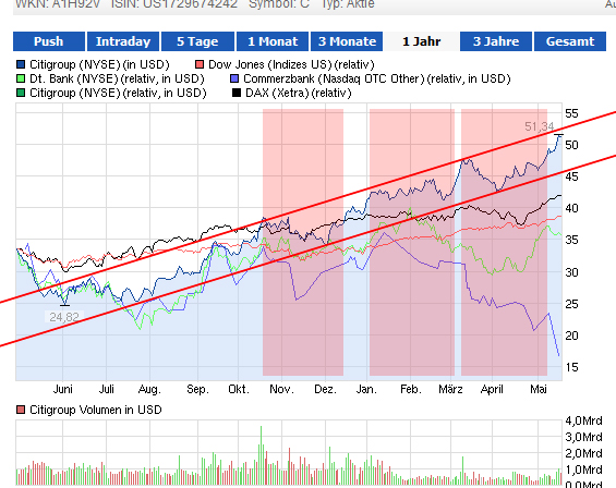 Ein Blick auf die US- Großbanken, auf Citi eben, besagt, dass hier noch ein weiteres Auf zu erwarten ist. Vll. macht's ja dann die Dividende, damit die Fonds auch wieder vermehrt nachfragen. Möglicherweise erwartet der Markt eine baldige Dividendenerhöhung, nach 0,01 $ zuletzt.