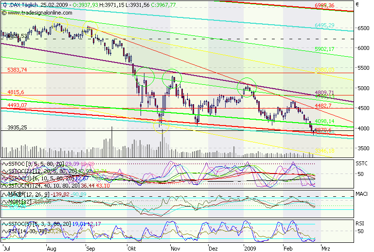 anbei der aktualisierte Chart. Bis auf wenige Punkte wurden gestern beide angestrebten Marken erreicht und der Dreh folgte auf den Fuß. Sollte heute ein positiver Tag werden, haben wir sogar die Möglichkeit für ein Candlestick-Kaufsignal im Tageschart. Das würde, zumindest für die nächsten Tage, die anfangs aufgestellte Vermutung bestätigen. Auf jeden Fall scheint es sich als richtig heraus gestellt zu haben, nicht Hals über Kopf unter 4ooo Punkten zu verkaufen. Shorts sollten vorerst überdacht werden (eventuell Tagesschluss abwarten), zumal die Amis gestern ein Kaufsignal generiert haben, ebenfalls an einer sehr wichtigen Marke.