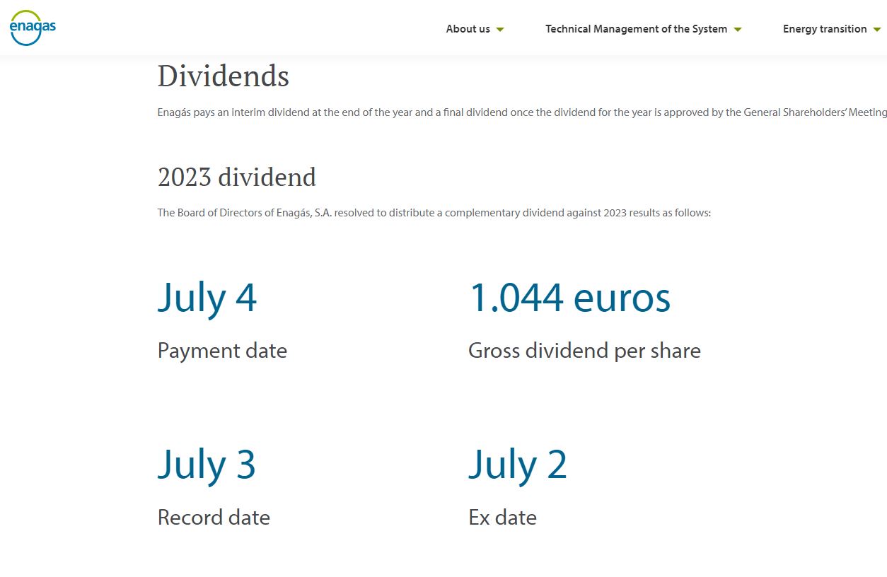 Bei Swissquote findet man eine Nachricht von Reuters: Feb 23 (Reuters) - Enagas SA : * TO PROPOSE FINAL DIVIDEND OF 1.032 EUROS GROSS PER SHARE TO BE PAID ON JULY 6.