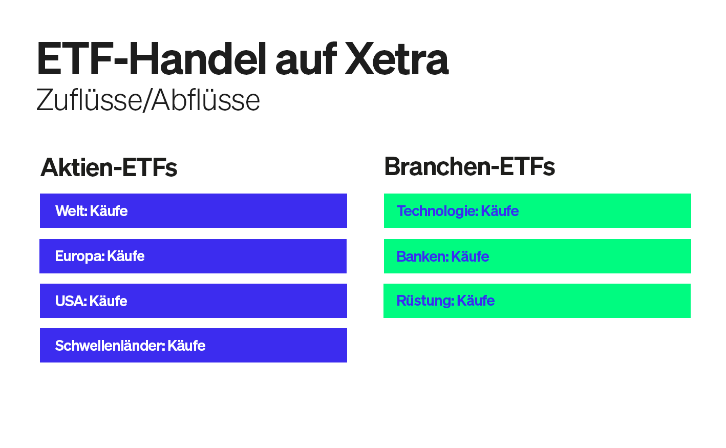 Im Handel mit Branchen-ETFs geht es vor allem um Tech-Aktien. Gesucht bleiben Mohr zufolge der Xtrackers Artificial Intelligence & Big Data (IE00BGV5VN51) und der iShares S&P 500 Information Technology Sector (IE00B3WJKG14), abgegeben würden der Amundi MSCI World Information Technology (LU0533033667) und der iShares Digital Security (IE00BG0J4C88). Großes Interesse beobachtet er zudem weiter an Banken-ETFs (DE0002635307).